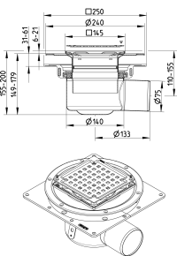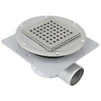BLÜCHER Domestic-150 justerbar afløb for indbygning i svalehaleplader og for beton- og klinkegulve, med vandret Ø75mm udløb, med membranflange |