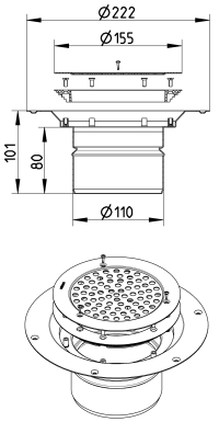 BLÜCHER Domestic-150 afløb for vinylgulve, med lodret Ø110mm udløb, lav model. Kan monteres med indbygningsvandlås |