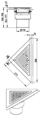 Blücher Trio type 350. Til hjørneinstallation mod 2 bagvæg i beton- og klinkegulve, med lodret Ø110mm udløb, med membranflange til vådrumssikring.