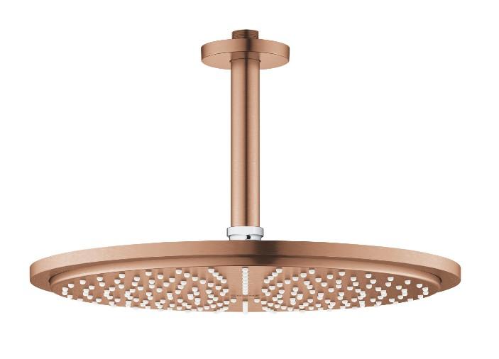 Grohe Rainshower Cosmopolitan 310 hovedbruser t/loft - Børstet warm sunset OBS: Varen er på lager - både til afhentning og dag-til-dag levering. Rainshower Cosmopolitan hovedbrusersættet er storebroderen til Rainshower Cosmopolitan 210 og giver endnu mere komfort via den bredere bruseflade på 310 mm. På denne måde kan du nyde strålemønsteret PureRain med de store og bløde dråber endnu mere intenst. Som sommerregn. Brusehovedet leveres med en brusearm til loftet. Brusehovedet er udstyret med GROHE DreamSpray, der sikrer et optimalt strålemønster, samt vores SpeedClean antikalksystem og DropStop, så du aldrig har problemer med, at der drypper vand fra brusehovedet ned på din ryg, når du lige har tørret den. Så hos GROHE bliver vi ved med at tænke på nye måder at forbedre vores produkter på, så du får endnu flere fornøjelser med vand.