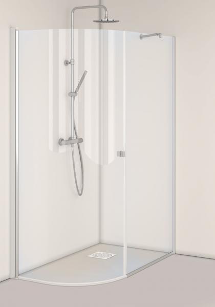 Brusehjørne med en svingbar J-dør og en fast brusevæg. Dørene er vendbare og kan derfor højreeller venstremonteres. Brusestangen kan monteres på tre måder: på væggen, i loftet eller vinkelret på samme væg, hvor bruseren monteres. Det er monteringsvenligt og har limbare profiler i aluminium. Nemt at installere og justere for én person, InstaQuick™. Henholdsvis 6 mm og 8 mm hærdet sikkerhedsglas. 8 mm frihøjde fra gulvet. Højde 2000 mm. Kan monteres med udvendige 12-mm-rør, cc 35 mm. Der fås en forlængelsesprofil til udvendige rør. 18 mm glideskinne medfølger