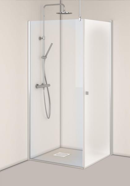 En fast brusevæg og en svingbar dør monteret i hjørne eller i nische.