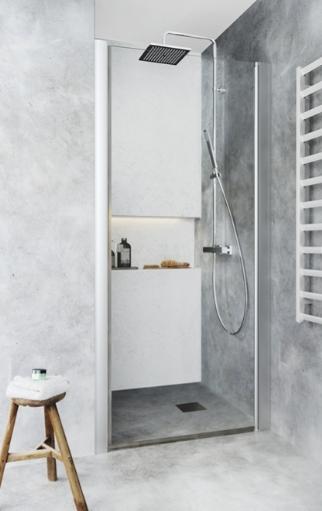 Monteringsvenlig lige brusedør med limbar profil i aluminium. Vendbar. Nem at installere og justere for én person, InstaQuick™. 6 mm hærdet sikkerhedsglas. 8 mm frihøjde fra gulvet. Højde 2000 mm. Kan monteres med udvendige 12-mm-rør, cc 35 mm. 18 mm glideskinne medfølger.