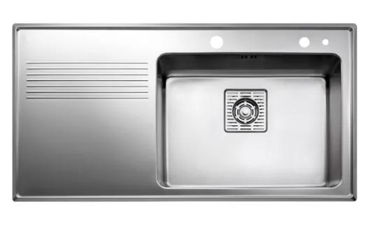 IntraFrame FR97SXRF - Højrevendt køkkenvask Køkkenvask for under- eller planlimning med meget stor vask og afløbsbakke. De stramme linjer og afrundede hjørner giver et moderne, men harmonisk udtryk. Leveres med løftopventil, overløb, afløbsrist og vandlås. Sæbedispenser og skyllekurv i sort plast er inkl.