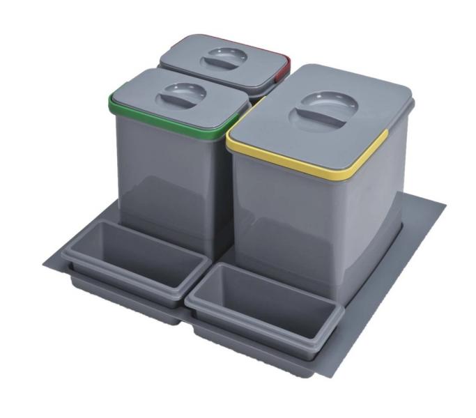 Intra Juvel Practiko 600-3 affaldssystem m/2 spande og opbevaringsbakke Smart affaldssystem med 2 mindre spande, 1 stor og smart opbevaring foran spandene. Hver spand har farvede håndtag i forskellige farver, så det er nemt at identificere den rette spand til det rette affald. Ydermere har begge spande låg. Dette affaldssystem fra Intra Juvel er beregnet til montering i skuffe. Specifikationer: