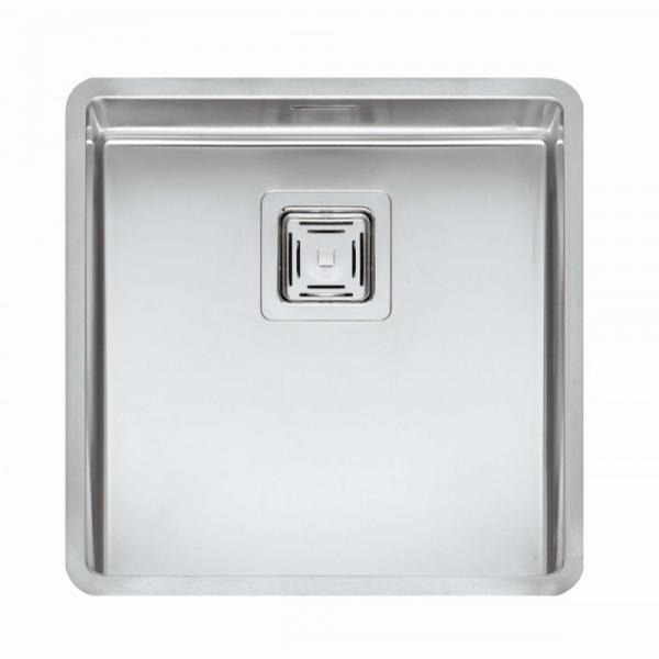 Rustfri stålvask, uden hanehul, i moderne firkantet design med kvadratisk afløb.