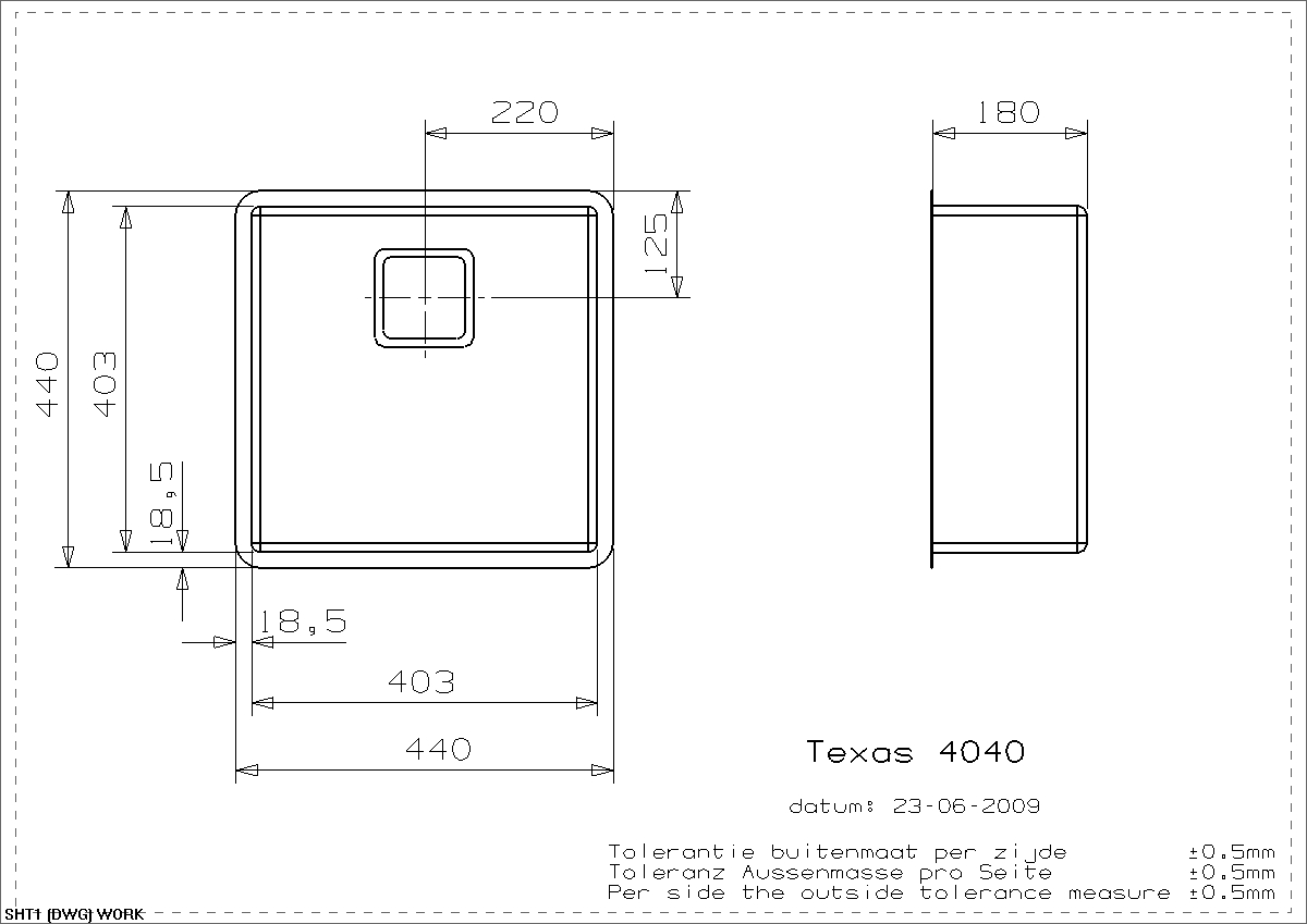 De indvendige runde (R: 10 mm.) hjørner følger vaskens yderkant, hvilket giver et harmonisk design, ligeledes er de indvendige runde hjørner rengøringsvenlige.
