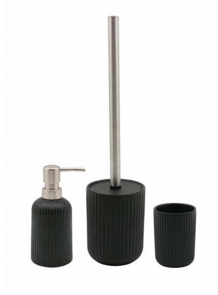 Nortiq tilbehørssæt til bad - Mat sort Nortiq badeværelsessæt skaber en helhed på badeværelset. Sættet består af matchende sæbedispenser, tandkrus og toiletbørsteholder, der tilsammen formår at binde rummet sammen. Produkterne er lavet af keramik og har en flot mat sort. På trods af sættes enkelthed og simple design, så giver den riflede overflade et særegent udtryk, der pynter på badeværelset. Sæbedispenseren kan genopfyldes med flydende sæbe, og dens pumpehoved er af børstet aluminium. Derudover kan toiletbørstehovedet udskiftes for at opretholde en optimal hygiejne. Toiletbørstens håndtag er produceret af rustfrit stål.