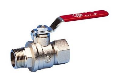 Kraftig kuglehane med fuldt gennemløb. TEA overfladebehandling. Muffe/nippel. Rødt stålhåndtag.