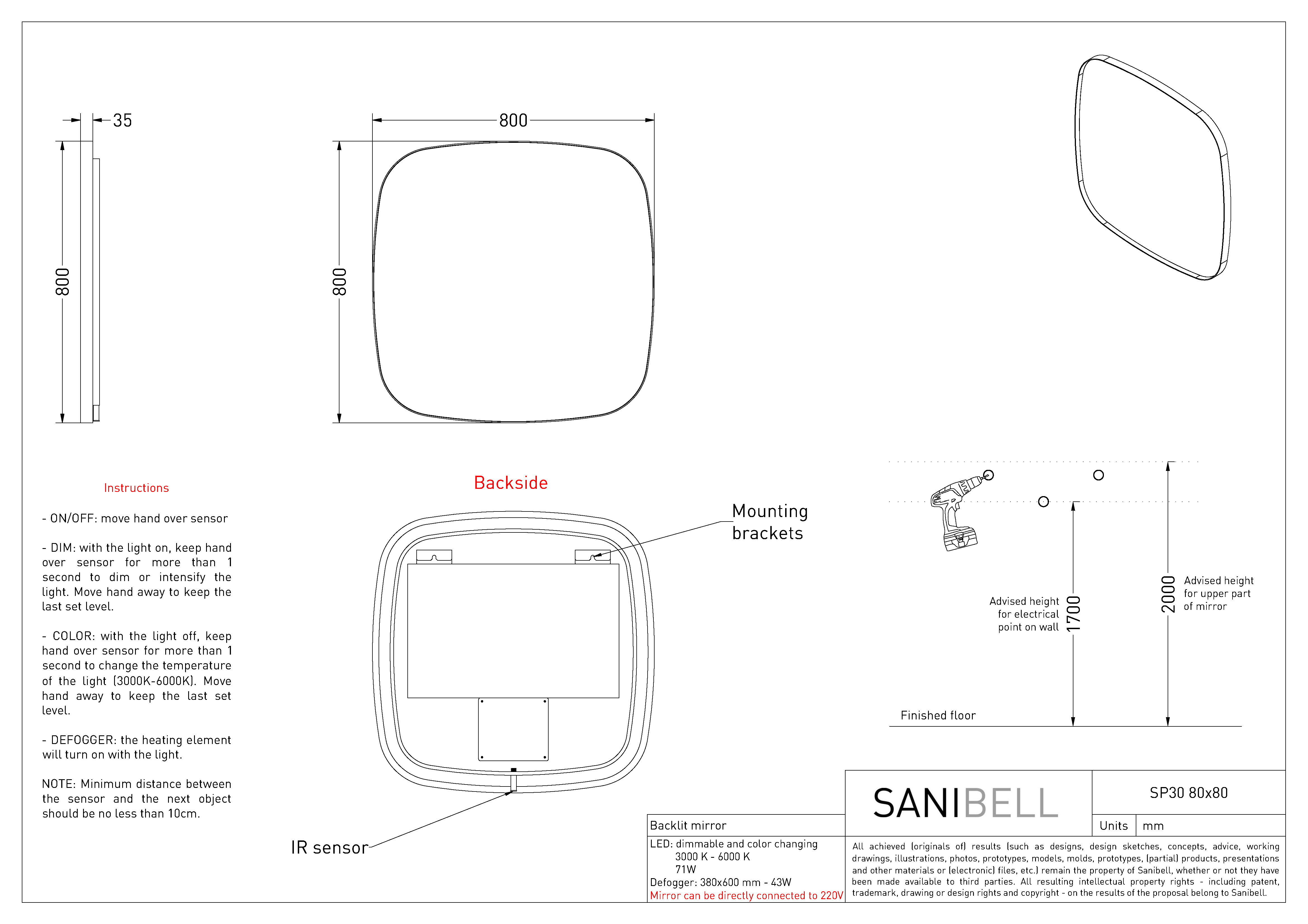 Sanibell Ink SP30 superellipse spejl m/backlight, varme og sensor 80 x 80 cm - Børstet mat guld Sanibell Ink spejl i superellipse form: Den afrundede firkantede form er både bryder linjerne på badeværelset, men virker på samme tid samlende for det visuelle udtryk i indretningen. Spejlet er indrammet af en flot ramme, som er slank forfra, men fra siden er bredere. Spejlet lyser væggen bag sig op med sit indirekte lys, som kan justeres i både styrke og farvetemperatur ved brug af sensorkontakten i bunden af spejlet. Udover backlight har spejlet også indbygget varmefelt, hvilket betyder at du kan nyde den luksuriøse oplevelse af et dugfrit spejl - selvom om du lige har taget et langt varmt bad. Specifikationer: