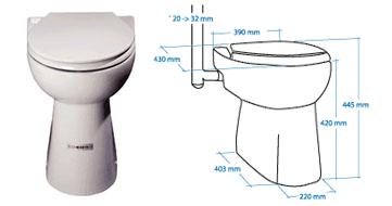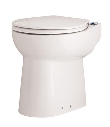 Komplet toilet med toiletsæde (m/ låg). Tryk på skylleknap aktiverer den støjdæmpede motor som bortpumper restproduktet ad et 32 mm afløbsrør. Toilettet er inkl. kontraventil, så restproduktet sendes opad. Mulighed for at tilslutte håndvask. Mål: