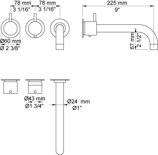 Vola Indbygningstermostat med fast afgangsmuffe Fast udløb, 225 mm, ø24 mm Rosetter Krom 16 3/4''RG/PEX |