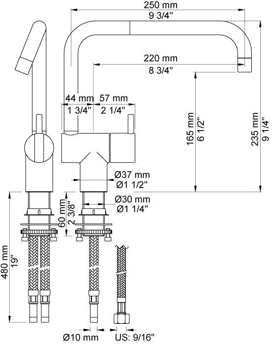 Vola Et-grebsblander med keramisk ventilenhed og dobbelt svingbar tud Dobbelt svingbar udløb, udlæg 250 mm, |