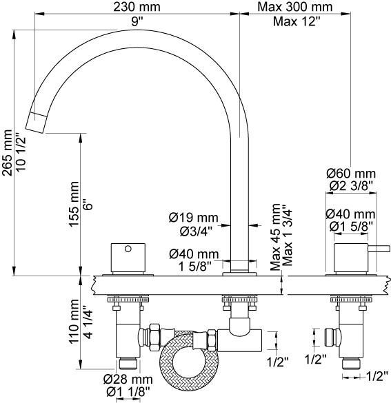 Vola To-grebsblander bestående af 2 stk keramiske stopventiler Svingbar udløb, udlæg 230 mm, ø19 mm Standard 25 mm Rosetter Krom 16 ½''RG |